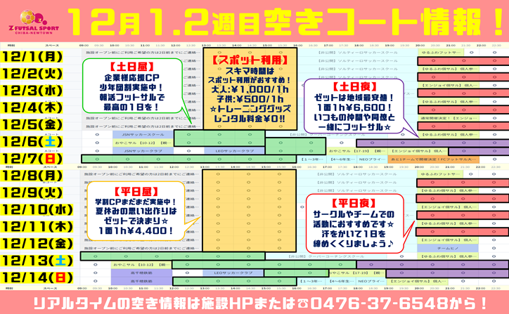 レンタルコート500円OFFのみ火曜日限定とはなりますが、いつも北総線をご利用されている方はこの際に手ぶらで個サルにご参加いただいたり、お得にコートをレンタルして仲間や家族と楽しいフットサルの時間を過ごされてはいかがでしょうか?