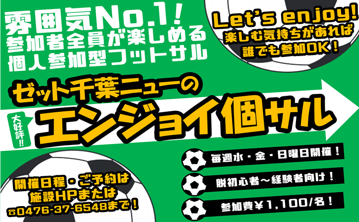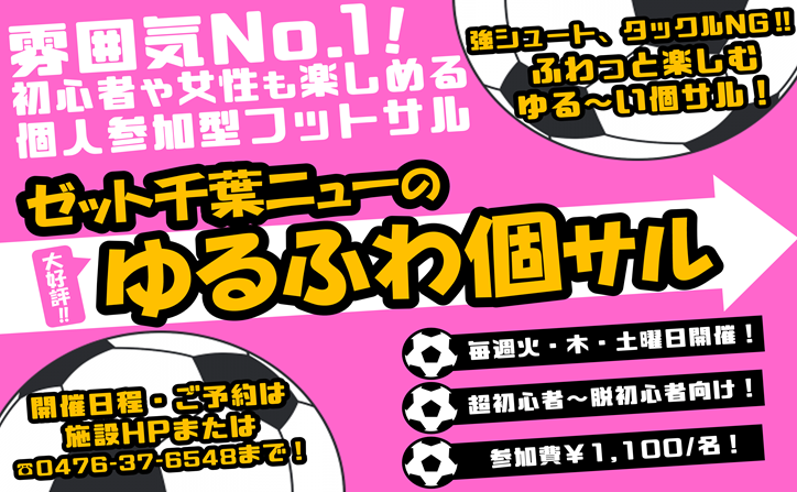ゼット千葉ニューではサッカー、フットサル経験者の方向けエンジョイ個サルや初心者の方向けのゆるふわ個サルなど各カテゴリーで個人参加フットサルを毎日開催中!