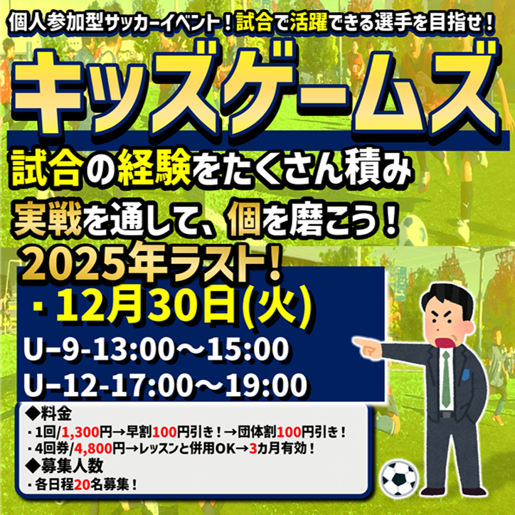 キッズゲームズ「試合で活躍できる選手を目指せ!」 12月も開催!キッズゲームズ最新情報‼ 小学生限定の試合イベント、【キッズゲームズ】の最新情報です!(^▽^)…