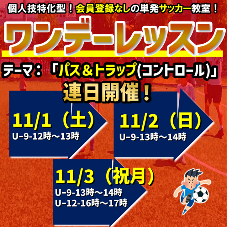 11/1(土)ワンデーレッスン!テーマ:パス・トラップ(コントロール)