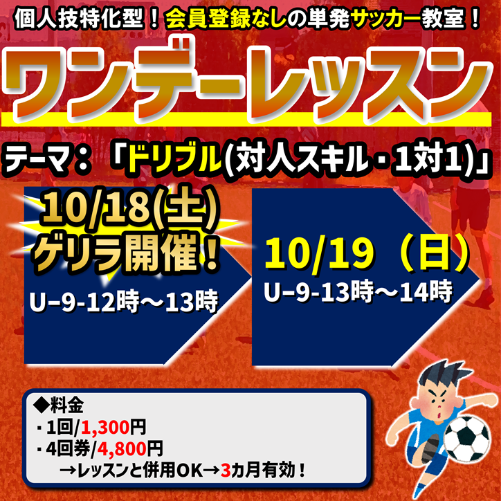 10月ワンデーレッスン最新情報!! 10月開催決定!サッカーの様々な場面が学べる単発サッカー教室! 自分が伸ばしたいテーマや、苦手だからうまくなりたいというテー … 続きを読む ワンデーレッスン!テーマ:ドリブル(1対1・対人)
