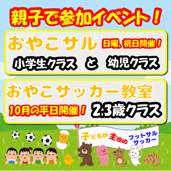 10月も毎週『おやこサル』を開催いたします!その日にお集まりいただいた親子の皆さんでチーム分けを行い、時間いっぱいフットサルの試合をお楽しみいただくイベントです … 続きを読む ★親子参加イベント♪(おやこサル、おやこサッカー教室)