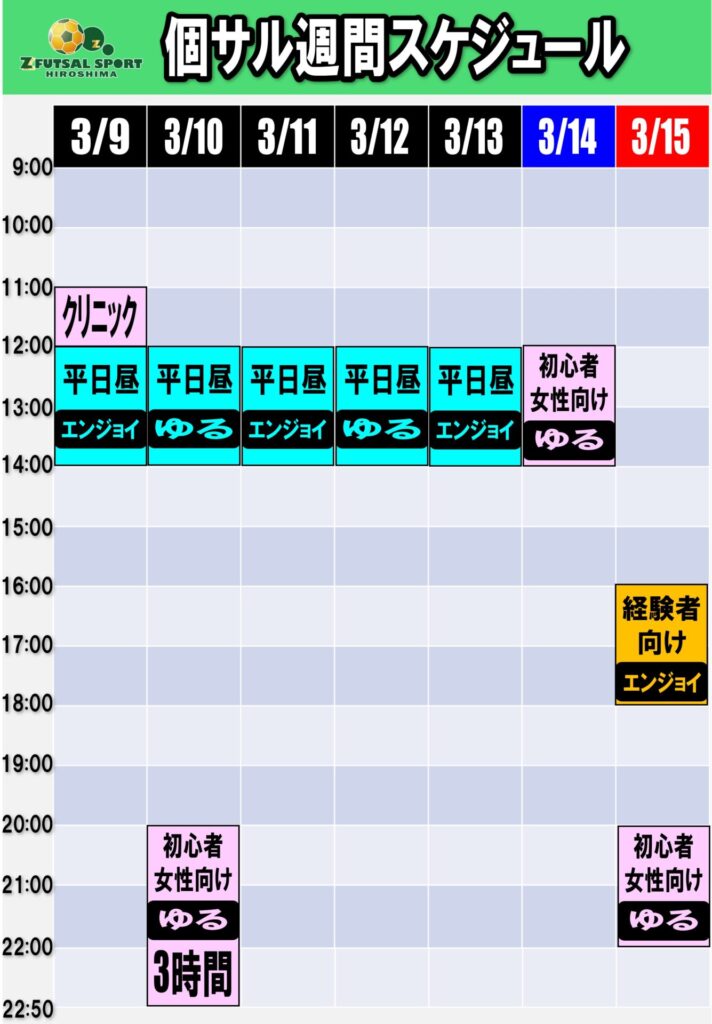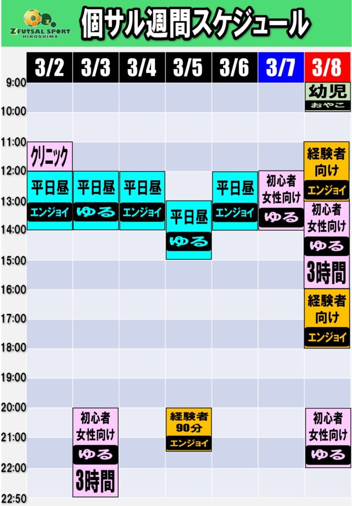 ゼットフットサルひろしまで大人気のコンテンツ『個サル(個人参加型フットサル)』の1週間のスケジュールを一目でわかりやすく!