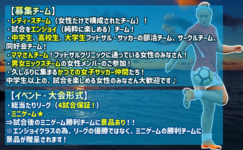 ⚽12月開催!第3回🎉『♥ENJOY WOMEN’S CUP🏆』~女子限定‼フットサル大会‼~大会後のミニゲームで景品ゲット!