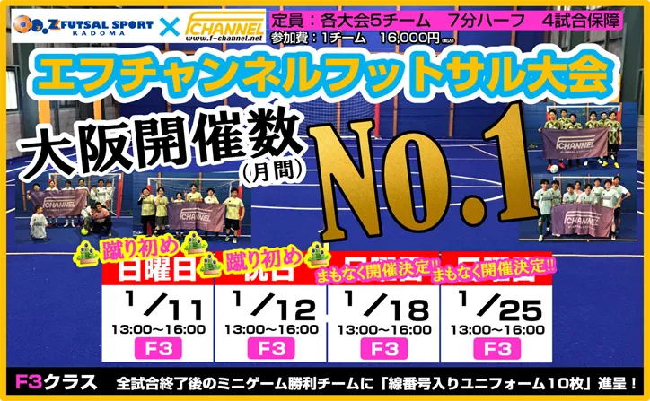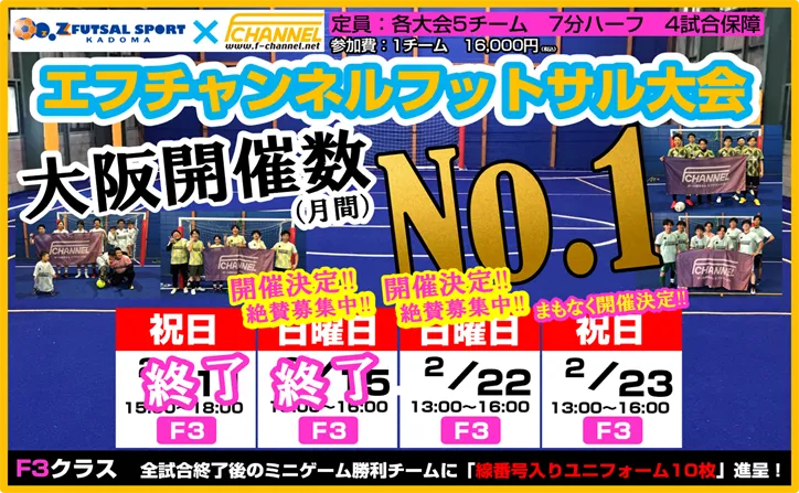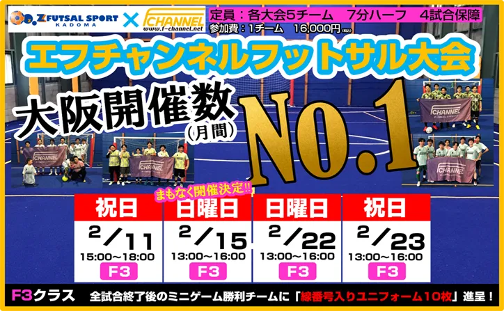 Z FUTSAL SPORT カドマ(門真)では、定期的にフットサル大会を開催しております。中でも一番人気はエフチャンネル協力の「抽選orミニゲームで背番号入りユニフォーム10枚GETのエンジョイフットサル大会」。