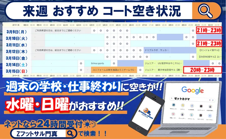 平日夜や、土日夜の時間帯は個サル枠が多くなっておりますが、「すでに埋まっていて予約できなかった」とあきらめないでください!!