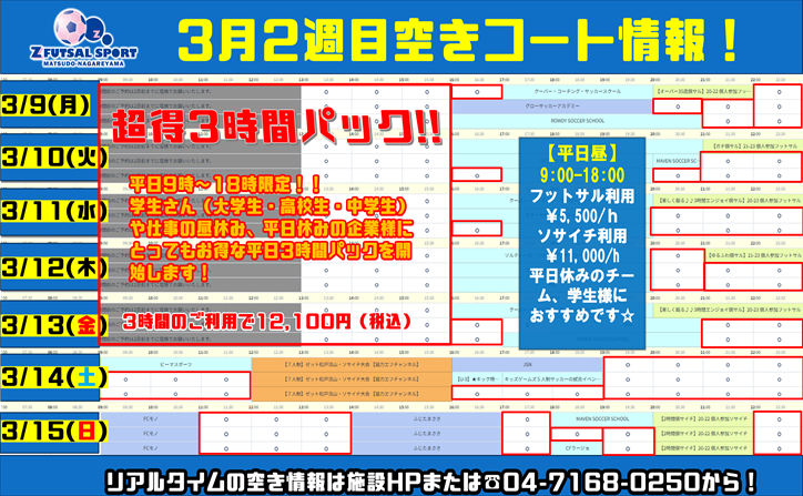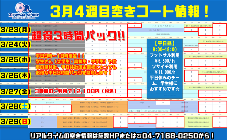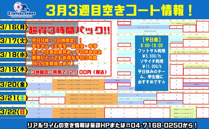 ゼット松戸流山レンタルコート空き枠速報!3月も”Z”で蹴ろう!!