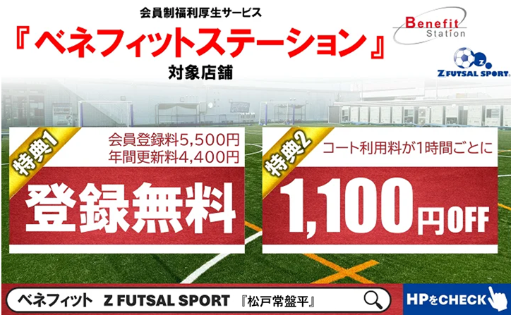 ゼットフットサルスポルト松戸常盤平店はベネフィット・ステーションの会員限定優待加盟店となりました!