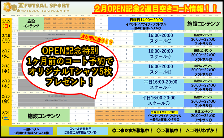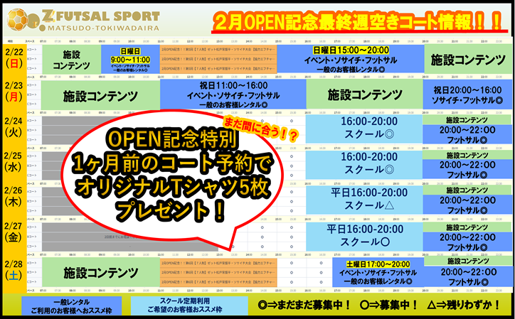 2月22日(日)~2月28日(土)空きコート【2月22日はZの日】