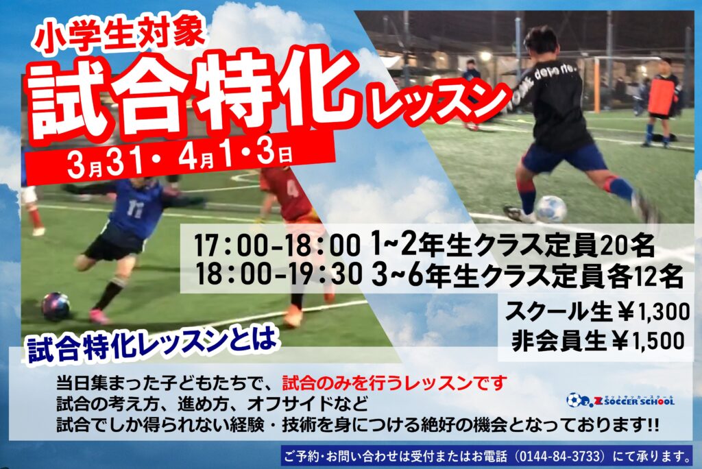 『試合特化レッスン』 サッカーはやっぱり試合が楽しい!!もっと多く試合がしたい!!そんな声にお応えして『試合特化レッスン』が誕生しました!! 試合特化レッスンと…