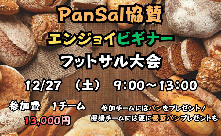 12月のエンジョイフットサル大会! 優勝賞品はなんと・・・「パンサル様のパン!!」また、参加するすべてのチームにもパンをプレゼント!🍞この度苫小牧にある、無添加…