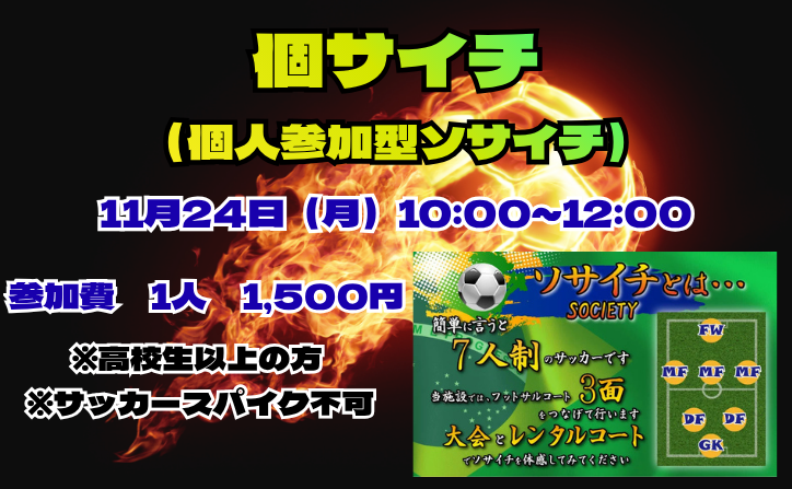 個人参加型ソサイチその名も「個サイチ」 ゼットフットサルスポルト北海道苫小牧スタジアムでは個人参加型ソサイチ、通称「個サイチ」を開催します!個人参加型フットサル…